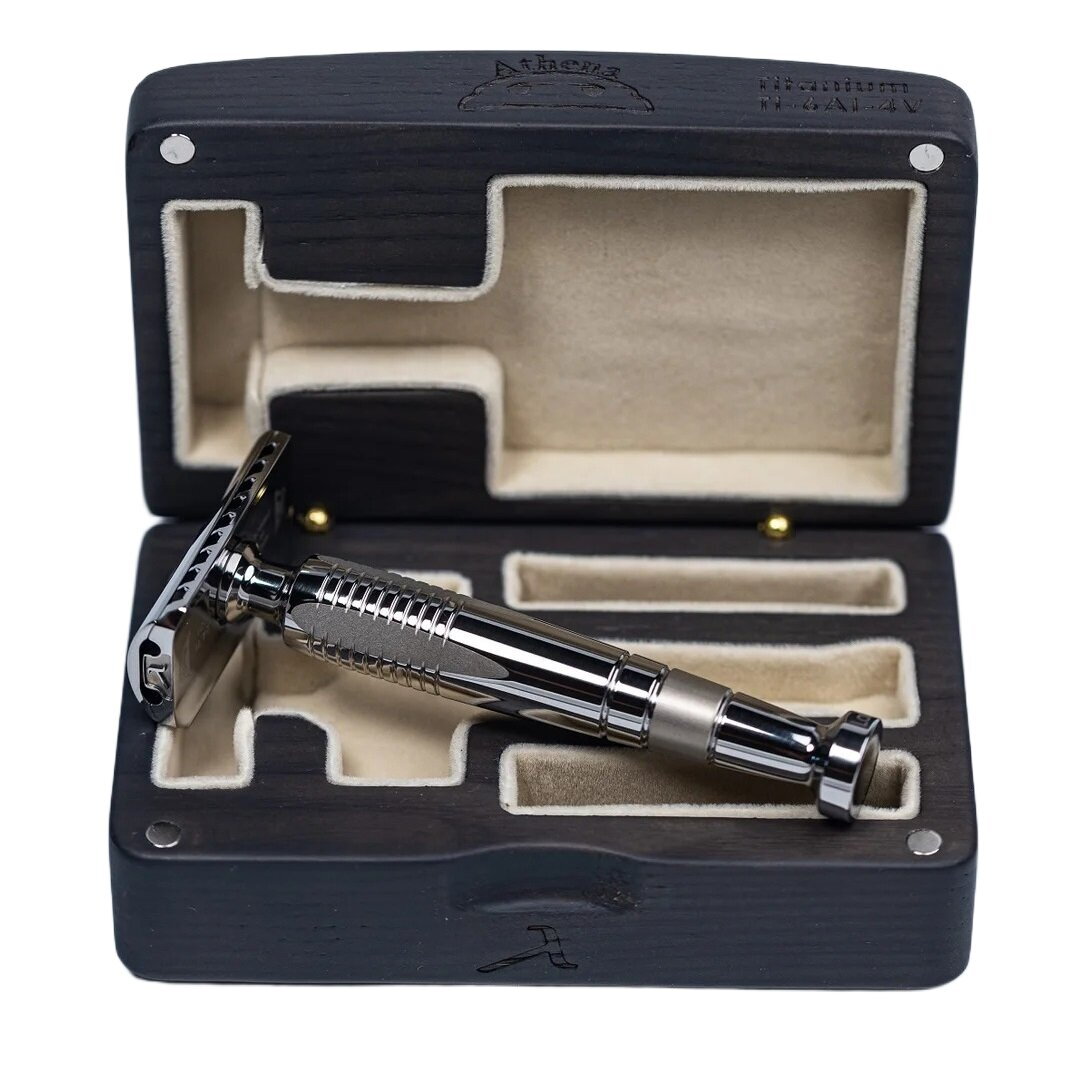 Бритва Lambda Athena Titanium приедет к своему владельцу в роскошном футляре из древесины маньчжурского ясеня (тамо) — прочного, упругого и текстурированного материала. На верхней крышке короба — логотип бренда.